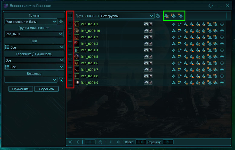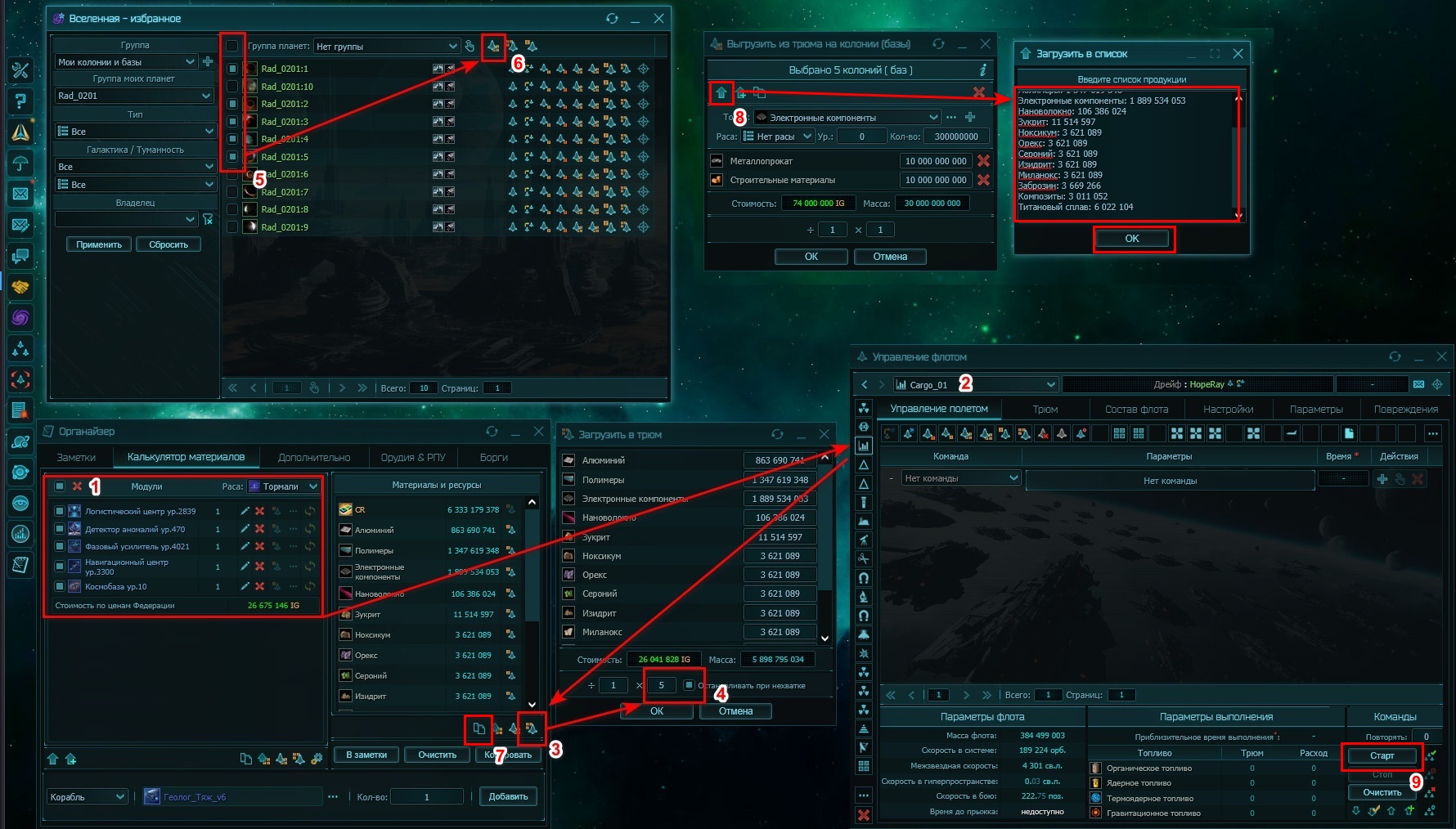 Выгрузить по спискувИзбранном. В результате появится окошко с данными о материалах и множителях, ничего не меняя жмёмOK- создаётся командный лист, с полётом к каждой выбранной чекбоксом колонии и выгрузки нужного набора материалов. - Жмём кнопку