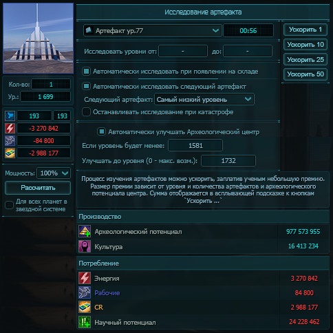 ![]() | Расстановка галочек важна, для безостановочной работы. Потери от «катастроф» не значительные и нас волновать не будут. Автоматическое улучшение археологического центра нужно выставить по доступным вам уровням. Настройка уровней лаборатории и арх.центра делается на основании доступных вам артефактов: уровень арх.центра должен производить столько арх.потенциала, чтобы исследовать доступные вам артефакты за 1 минуту (меньше нельзя), если это время больше - нужно задуматься над повышением уровня арх.центра. В свою очередь арх.центр для работы потребляет научный потенциал, его можно добыть любым способом, но на начальном этапе в случае дефицита легче всего или повысить уровень лаборатории или достроить ещё лабораторий. |